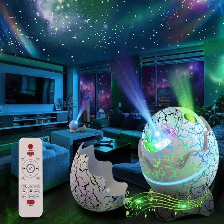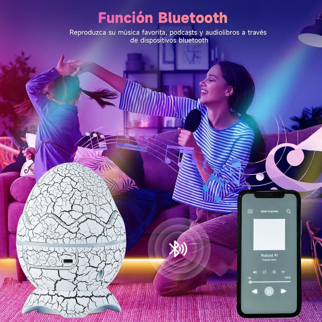 ¿Buscas el regalo perfecto o quieres darle un toque único a tu espacio? El Proyector DinoGalaxy no es solo una lámpara, es una experiencia inmersiva. Con su diseño único de huevo de dinosaurio "eclosionando", proyecta un espectacular cielo estrellado y auroras boreales mientras reproduce tu música favorita.