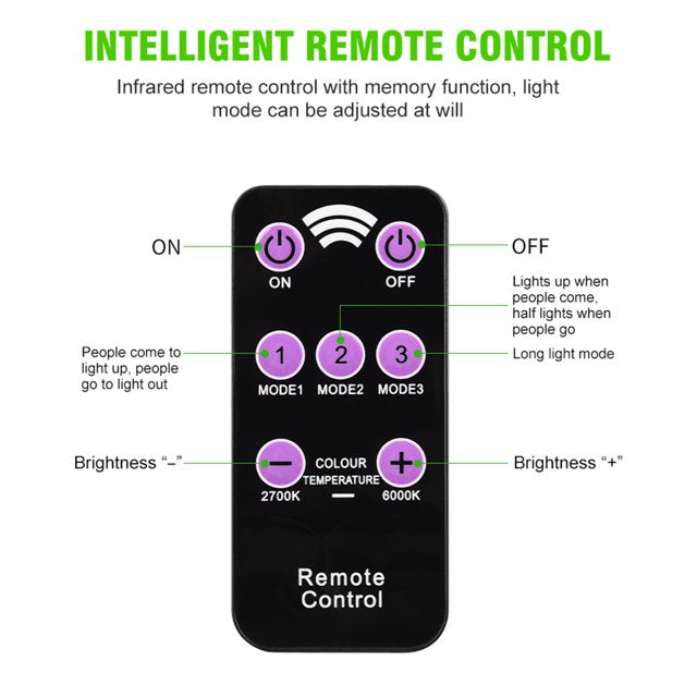 - Enciende automáticamente: el sensor de movimiento PIR puede escanear la fuente de calor que se mueve continuamente dentro del rango de detección. Cuando alguien aparece en el área, la luz se encenderá automáticamente.